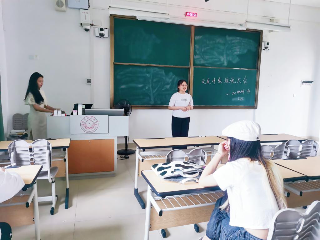 大会伊始,团支书代美玲向与会人员介绍发展对象推优大会投票方式及注意事项。接着,团支书告知与会人员候选人应符合的候选条件,并组织候选人依次上台进行自我评述。候选人们都表达自己对党与祖国的热爱,并说明自己的未来目标与计划。随后,由团支书发起不记名投票,推选出预发展对象。最后,团支书向预发展对象表示衷心祝贺,并希望他们能以党员标准严格规范个人行为,向典型模范学习,起到先锋模范作用。