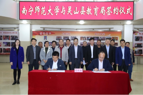 31日上午,在灵山县教育局召开教育专项调研座谈会,县教育局、人社局、交通局及灵山中学、新洲中学、灵山二中、三中等七所中小学幼儿园负责人和20多名校友参加了座谈会,座谈会由灵山县教育局邓云峰局长主持,县党委常委、组织部长赖华平参加座谈会。隆广庆副校长简要介绍了“十三五”以来学校在教师队伍、人才培养、博士点建设、教师培训等方面取得的成绩,对灵山县长期以来对我校各项事业发展给予的大力支持表示感谢。我校文学院2007级研究生校友、灵山县委常委、组织部部长赖华平回顾了在母校学习的情形,感谢母校的培养,高度评价了我校校友在灵山县经济建设、社会发展,特别是教育事业所作出的贡献,介绍灵山县经济社会发展情况以及人才引进政策,希望广大校友多宣传母校,为母校输送优质生源,多向南宁师范大学招才引智,加强与南宁师范大学开展培训合作。我校数学与统计学院1984级校友、灵山中学校长简信基等校友汇报了服务灵山县发展的情况,表达了对母校的感恩情怀。与会人员围绕教师培训、项目合作、教师招聘、实习基地建设等方面合作进行深入交流,形成了多项合作意向。会后我校教务处副处长覃城阜代表学校与灵山中学、新洲中学、灵山二中、灵城一中、灵城三中和灵城四中签订了教育实习基地协议,隆广庆副校长代表学校向上述六所基地学校授牌,并考察了百年学府灵山中学。
