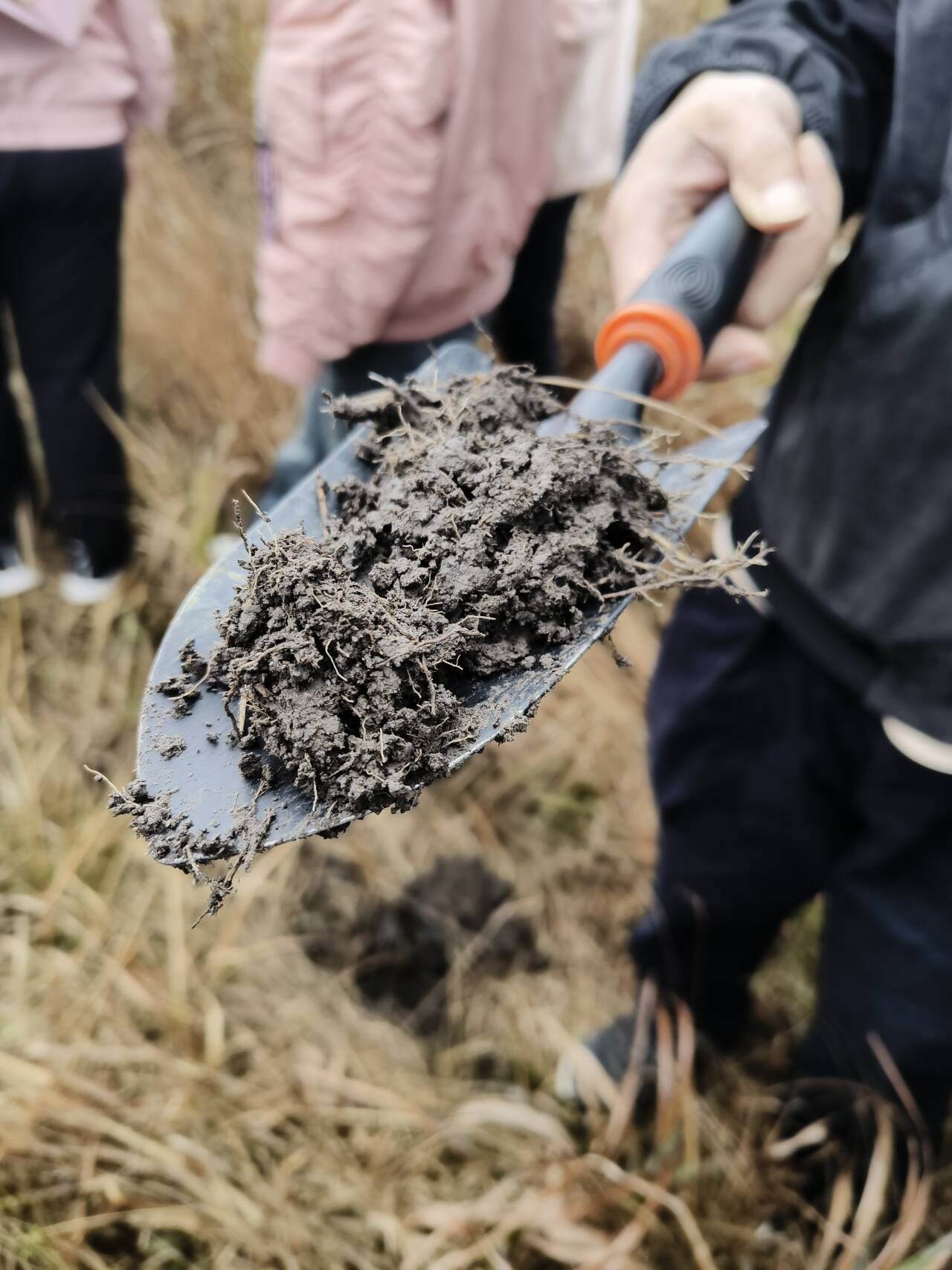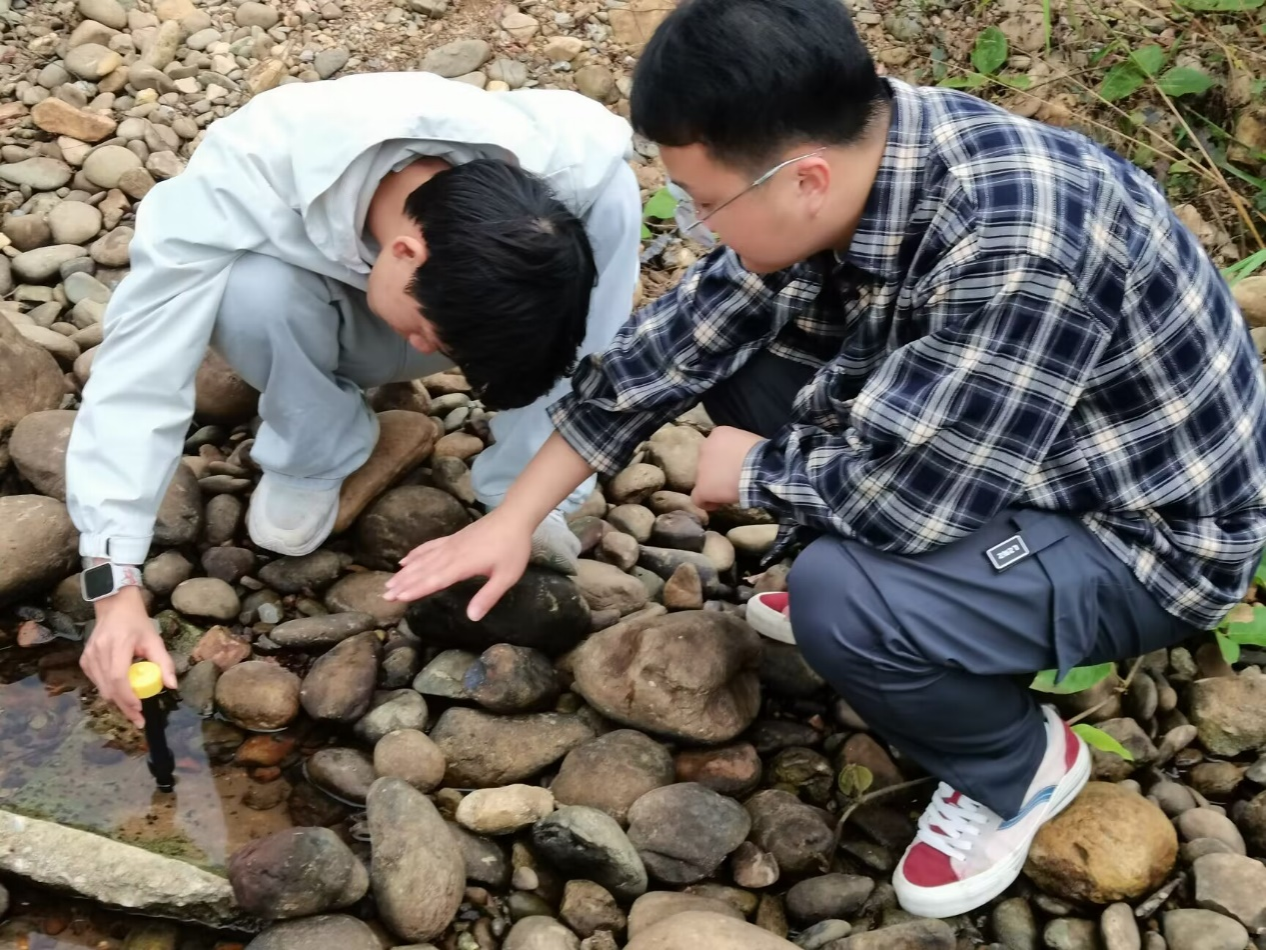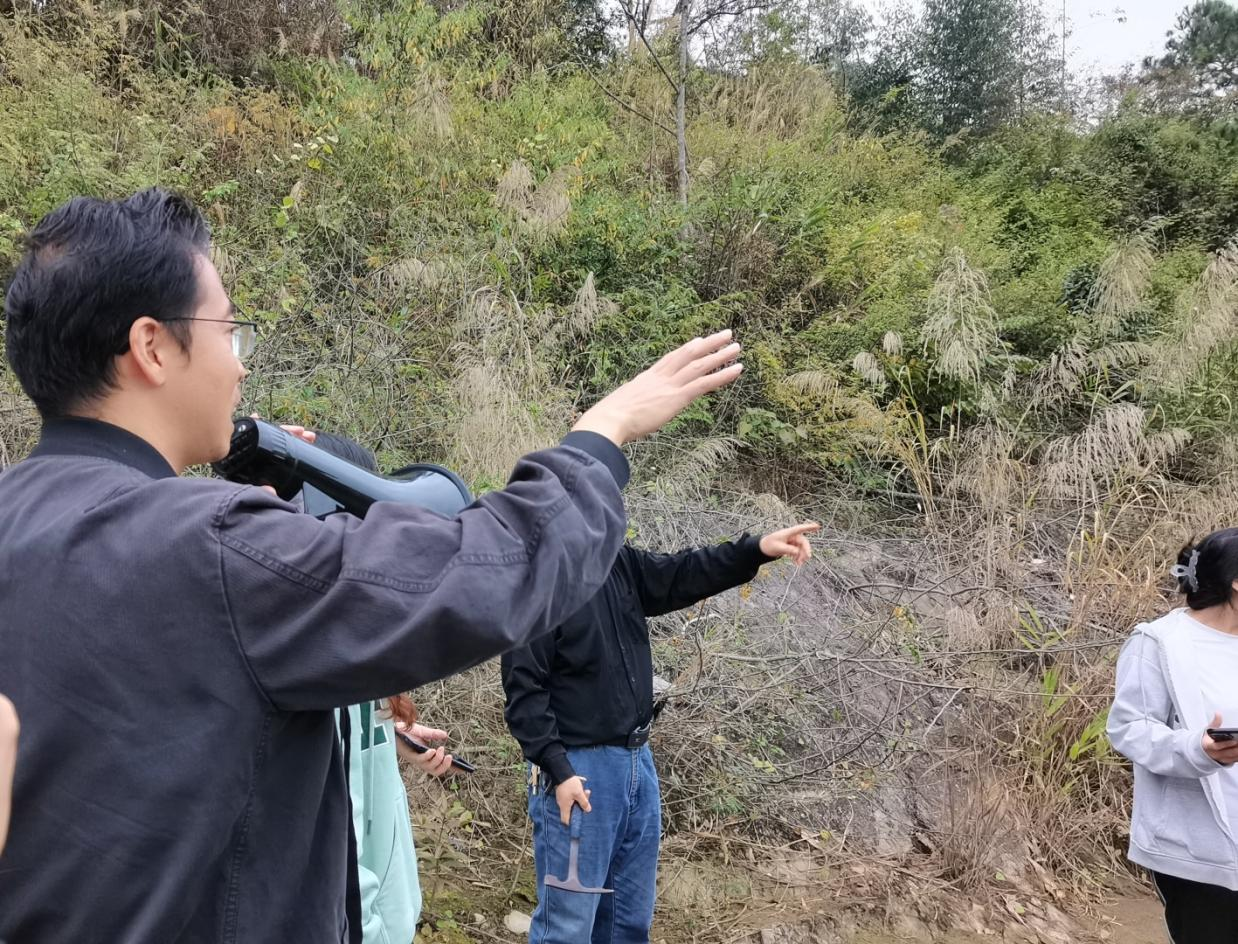 河床的观测点海拔约为130多米,首先老师讲解了河床的相关考察方法,然后让同学们观察河流沉积物的粒径大小、磨圆度和分选性、周围沉积物横截面特点、土壤的性质、植物的类型等方面进行考察,随后带领同学们往阶地上走。沿斜坡向上走,到达另一平缓地带,结合观察周围沉积物剖面,剖面可见沉积物在未完全风化的砾岩上部,沉积物当中有很多砾石,其砾石堆积与河床相比明显松散,由此判断为二级阶地。沉积物中砾石含量大于20%,不利于作物种植,但该地却种植了柑橘作为经济作物,经济效益较低。经过观察柑橘同时结果和开花,也表明了当地气候异常。另外,老师为同学们拓展了国家土地利用的相关政策,国家对我们脚下的每一寸土地都有详细规划,不可随意更改,同时老师引导同学们对“如何利用好每一片土地”进行了思考,作为一个地理人,把握好人地协调观是必要准则。