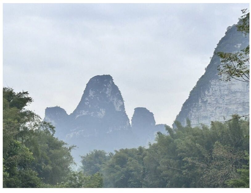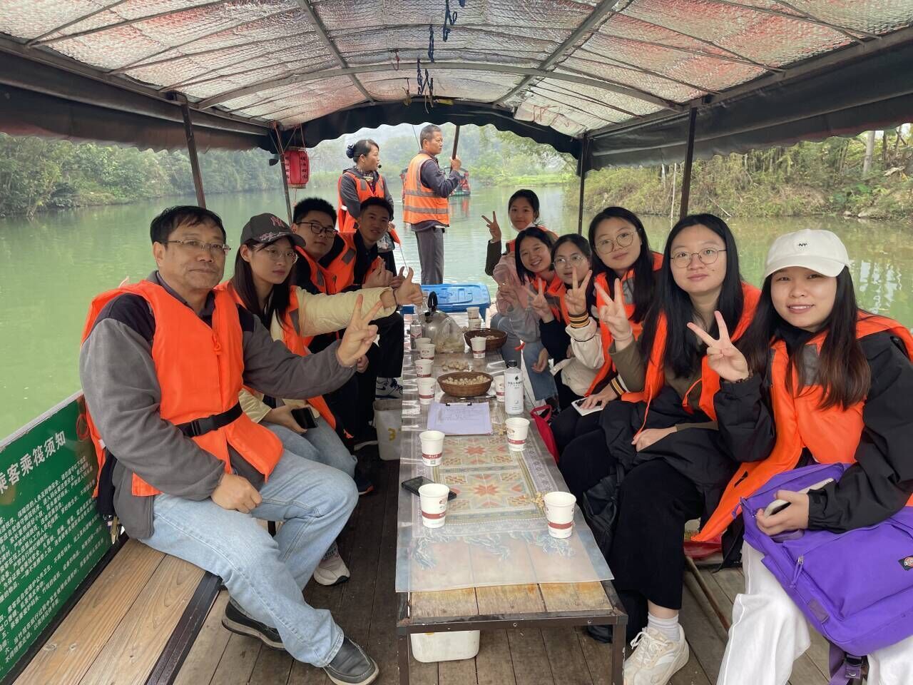 位于半山腰的观景台,同学们可以从不同的视野俯视鹅泉的美景:清澈的河水、高低不一的山峰、零星分布在河面上的竹排......