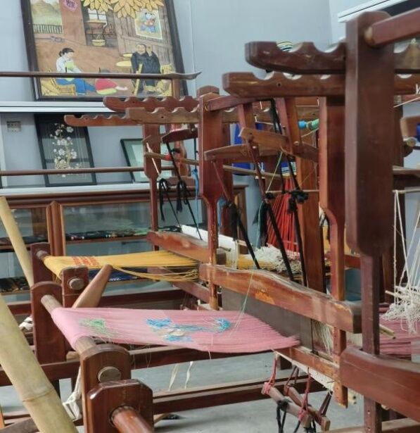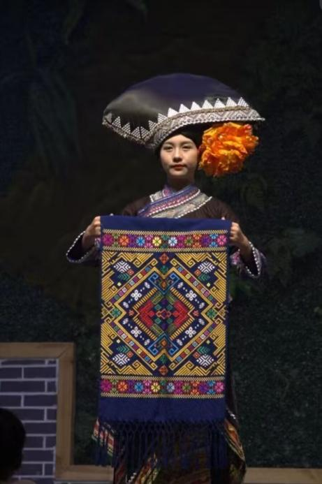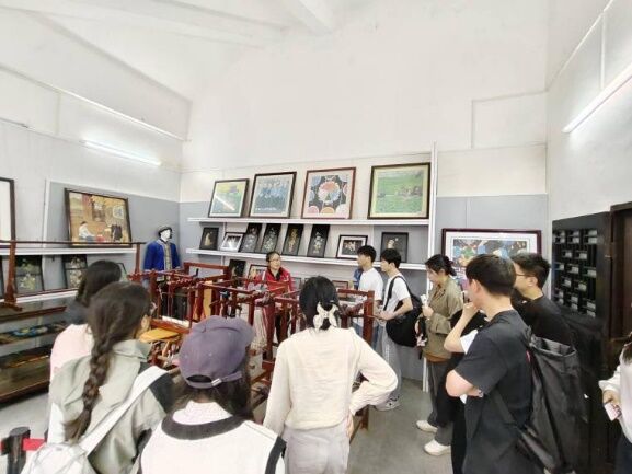 旧州壮族生态博物馆是我国第一座壮族生态博物馆,被称为“活着的壮族博物馆”,在馆中,秦年秀老师为大家讲解了壮族的服饰文化。馆内展示了壮族的民族服饰,传统的织布机以及壮锦。壮锦源于宋代,是广西民族文化瑰宝,传统的壮锦以棉、麻线作地经、地纬平纹交织;广西壮锦与南京云锦、成都蜀锦、苏州宋锦一同被誉为“四大名锦”。为更好地传承与发展,壮锦图案被广泛应用于城市公共环境中,如在南宁地铁中随处可见的壮锦图案、被命名为“壮锦大道”的道路,继承并不断发展壮锦文化,具有重要意义。