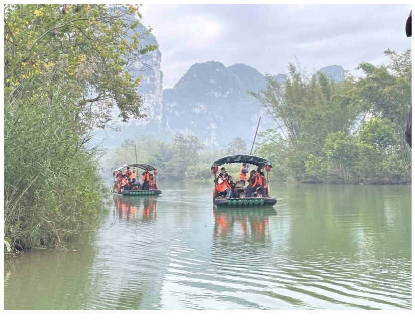 明仕田园的最佳游览方式就是乘坐竹排游明仕河,在这里,我们可以忘记时间的流逝,犹如进入无人之境,将所有风光尽收眼底。同学们乘坐竹筏,在这过程中,阿哥划过碧绿如画、清澈见底的河水,阿姐唱着淳朴婉转的山歌,大家观察着典型的喀斯特地貌,看到因形状得名的蜗牛山、著名的威武将军山、奇特的万乳崖等等。
