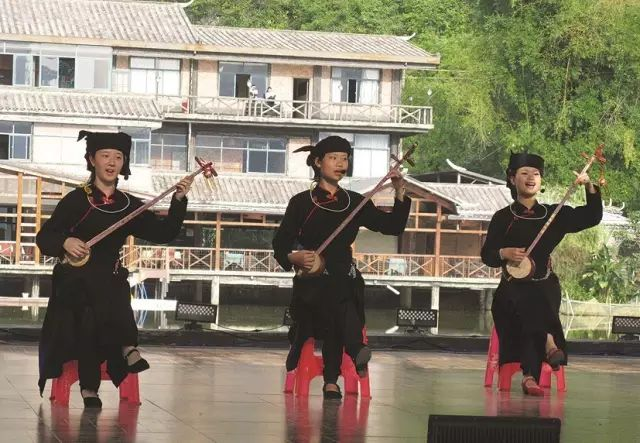在明仕田园的民族表演中观察到一个极具民族特色的弹弦乐器——天琴。天琴在壮语中称为鼎叮,流行于广西中越边境的壮族聚居地区,比如防城港市防城区峒中镇、崇左市宁明县、大新县和龙州县等地。古时候,天琴被天婆用于消除灾害、去除邪恶以及治疗疾病,再后来,被广泛用于大众性的重大节日、庆祝丰收、嫁娶等喜庆的活动。传统的天琴大多数是采用山桑木制成的,因为山桑木坚硬不易变形,且壮族人认为山桑木具有辟邪的作用。
