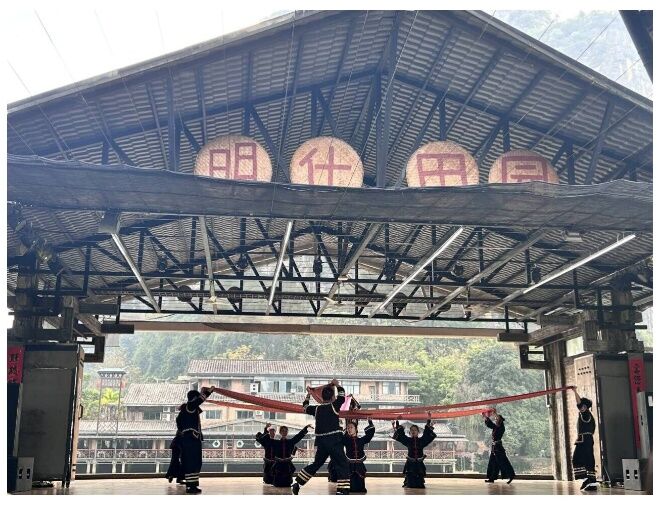 而在明仕田园的民族歌舞表演中,我们可以看到崇左市大新县的民族服饰色调以黑色为主,用蓝靛染制而成,因此他们被人们称为“黑衣壮”,又被誉为壮族传统文化的“活化石“。