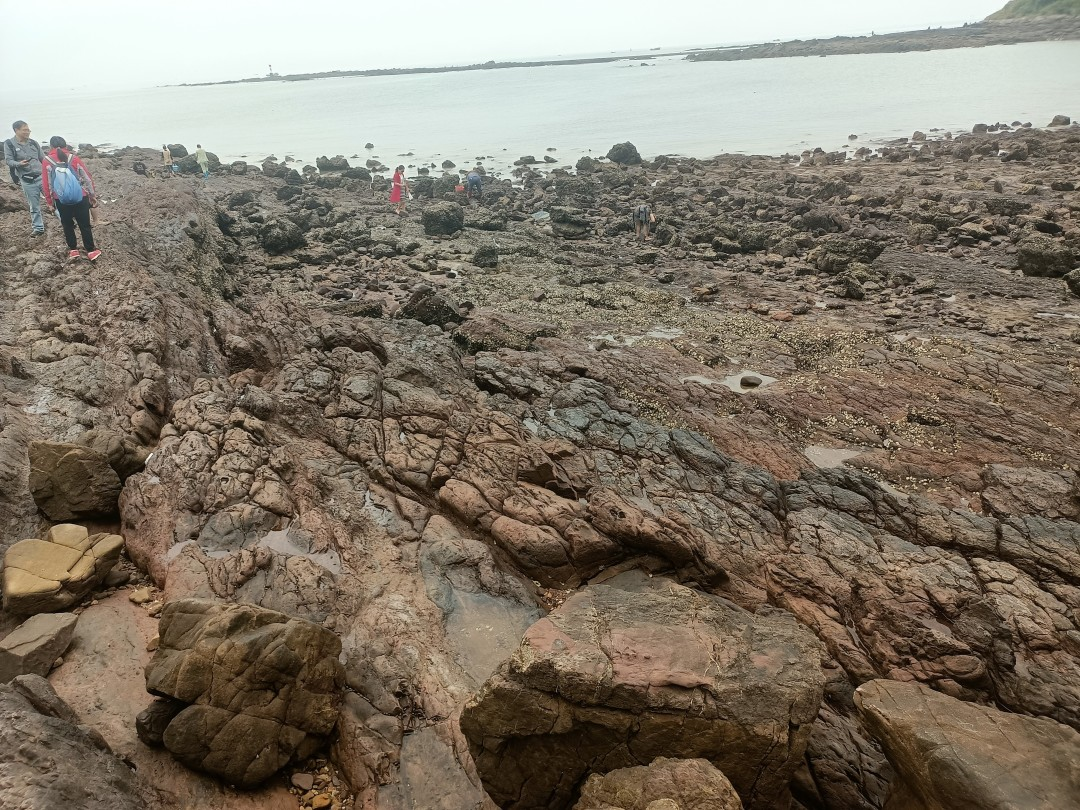 怪石滩位于江山半岛最南端,灯架岭前,属于海蚀基岩地貌,岩石呈褐红色,经海浪千百万年的冲刷,形成今天形态各异、奇形怪状的天然石雕群,当地百姓据此起名怪石滩。